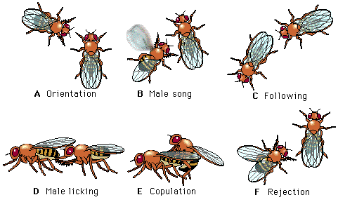 果蝇是一种小小的昆虫,是遗传学家的爱宠。现在,它也成为研究性和演化生物学家的爱宠。果蝇虽然简单,但它们也有相当复杂的求偶行为模式,上图既是雄性果蝇的求偶之舞。在果蝇中所获得的知识,对我们了解自己在亲密关系中的行为模式变化,也会很有帮助。