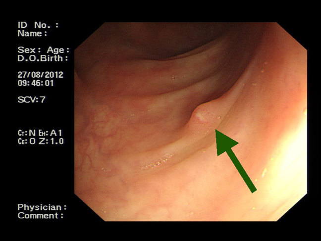 图 这个病人肠镜看到只有2毫米的突起,显微镜下发现已经是癌了。